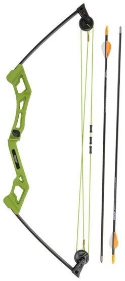 Youth bow set comes ready to shoot with two Safetyglass target arrows and a target. Set also includes finder fillers and arrow rest. Features 6 to 13-1/2 pound draw weight and 13 to 24 inch draw length range. Brace height is 8-1/2 inch and Axle-to-axle is 27 inches. Recommended age for Children is 4 years and up.