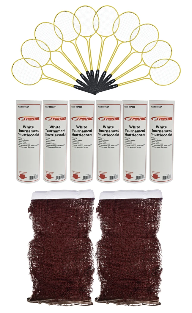 A complete Badminton Basic Pack including 2 tournament nets measuring 22 x 2 1/2 feet with a 3/4 inch square mesh, knotless nylon net and nylon-reinforced vinyl headband with braided-rope cable, 6 sets of Medium speed, foam base with blue band for tournament play and 10 Sportime Twin Steel Shaft with Hi-Soft PU grip racquets.